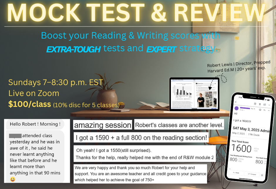 Full-test structured practice for students targeting an upcoming exam. Each class includes an extra-tough practice test, expert review, and one week of 30-min. daily homework.