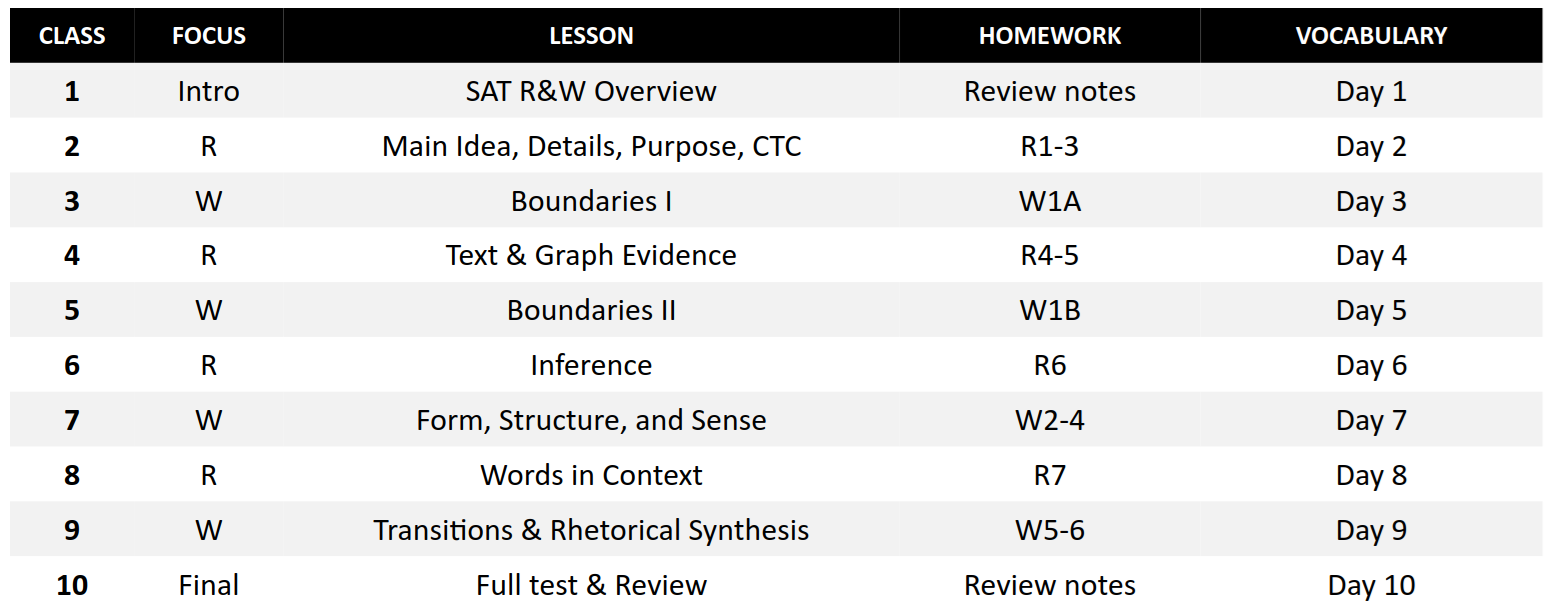 A complete 10-class (15-hr) program to reach a 700+ score from any level. Covers all 13 R&W concepts.